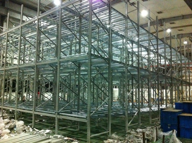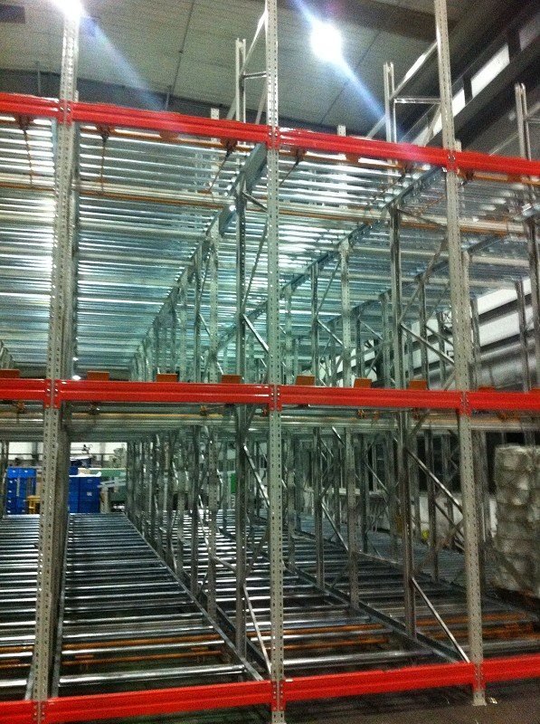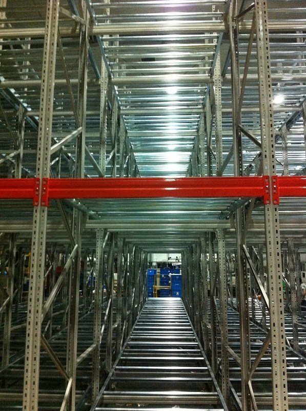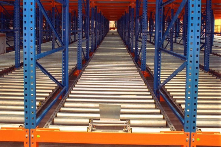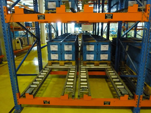 在货架的组与组之间没有作业通道,从而增加了60%的空间利用率,提高了仓储的容积率;托盘操作遵循先进先出的原则;自动储存回转;储存和拣选两个动作的分开大大提高输出量,由于是自重力使货物滑动,而且没有操作通道,所以减少了运输路线和叉车的数量。