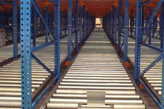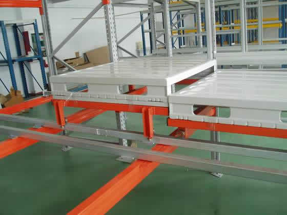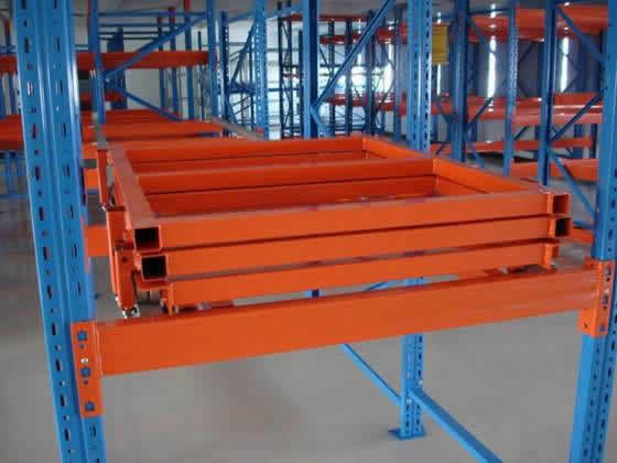 压入式货架也由托盘式货架演变而成,也叫后推式货架或推入式货架。采用轨道和托盘小车相结合的原理,轨道呈一定的坡度(3°左右),利用货物的自重,托盘货物被规定于单端存储,货物先进后出,适用于大批量少品种的货物存储,空间利用率很高,存取也较灵活方便。货架总深度不宜过深,一般在6个托盘深度以内,否则由于托盘小车相互嵌入的缘故而会使空间牺牲较大。单托货物重量一般在1500kg以内,货架高度一般在6m以下。 此类系统对货架的制造精度要求较高,托盘小车与导轨间的配合尤为重要,如制造、安装精度不高,极易导致货架系统的运行不畅。此类货架造价较高,非常适用于冷库或存储区域有限但急需增加储位面积的场合使用,在国内已有很多的应用。在国内只有一定规模的货架厂商生产此类货架。