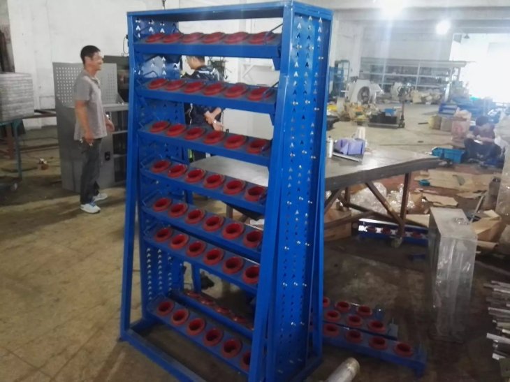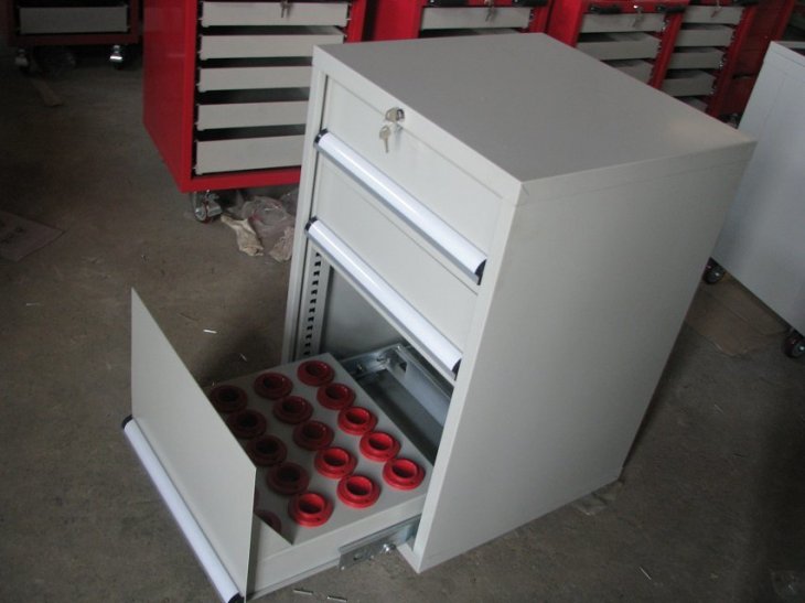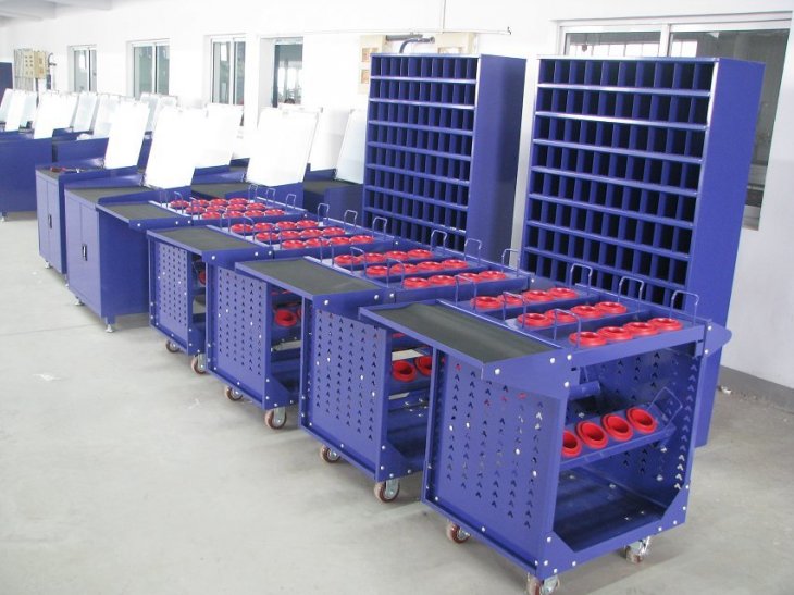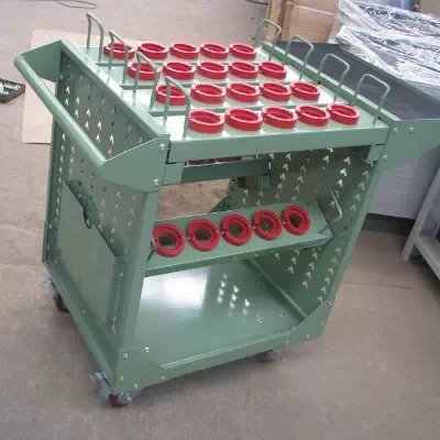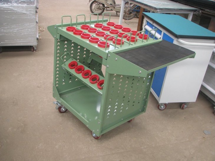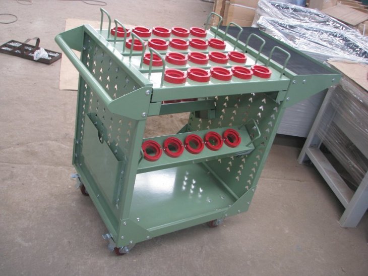 刀具车是存放、搬运刀具的装备,现代货架厂生产的HY-HSK系列刀具车成多边成型的前后侧板上有模数化的人字孔,可将刀具座挂板按水平或倾斜放置,方便多种刀具的存放。 高强度脚轮,车前为两个定向轮,车后为两个万向带 刹车轮,推行平稳,方向性好,刹车固定后不会滑动。 结构特点: 1.配有标签,明确分类. 2.快速拿出工具,节约查找时间. 3. 配有轮子,便于移动. 4.抽屉可拉出100% |