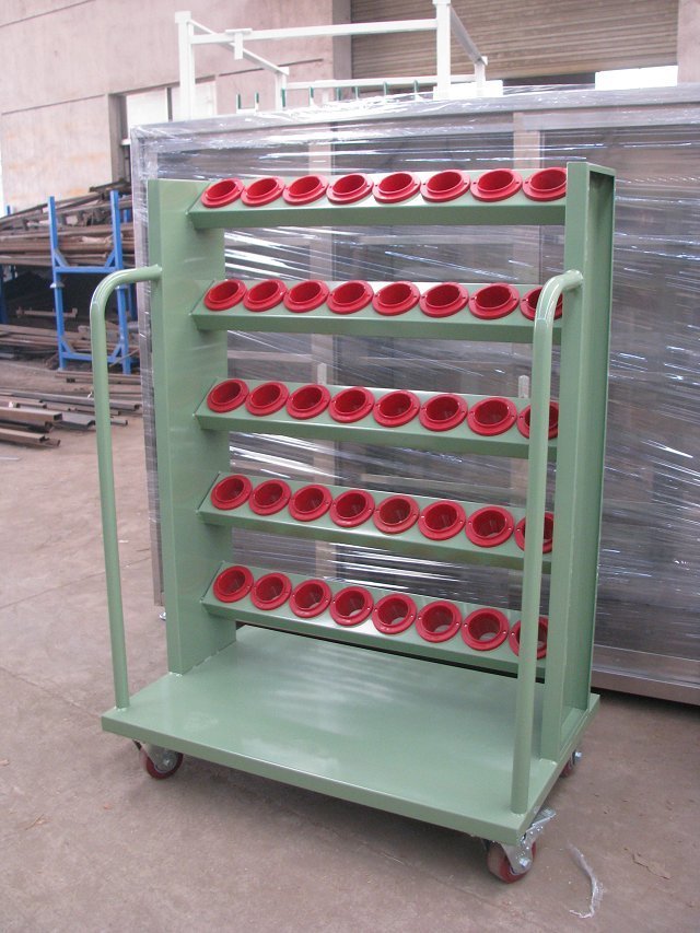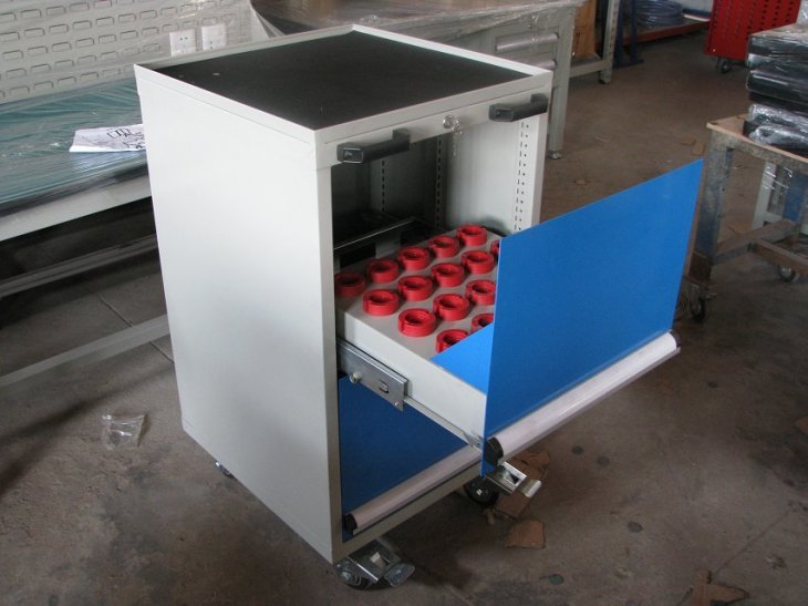 刀具车是存放、搬运刀具的装备,现代货架厂生产的HY-HSK系列刀具车成多边成型的前后侧板上有模数化的人字孔,可将刀具座挂板按水平或倾斜放置,方便多种刀具的存放。 高强度脚轮,车前为两个定向轮,车后为两个万向带 刹车轮,推行平稳,方向性好,刹车固定后不会滑动。 结构特点: 1.配有标签,明确分类. 2.快速拿出工具,节约查找时间. 3. 配有轮子,便于移动. 4.抽屉可拉出100%