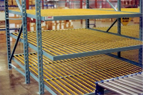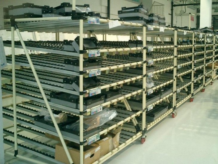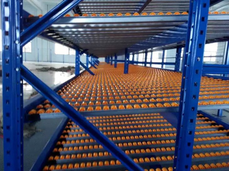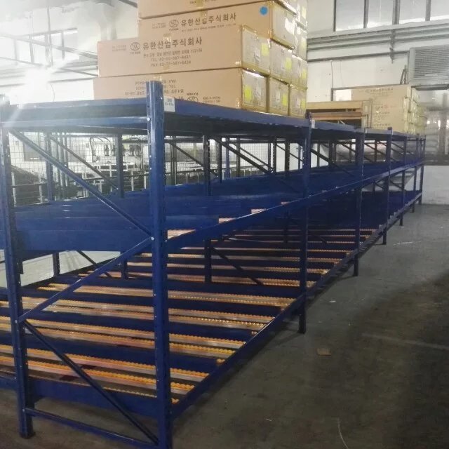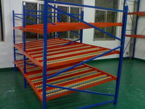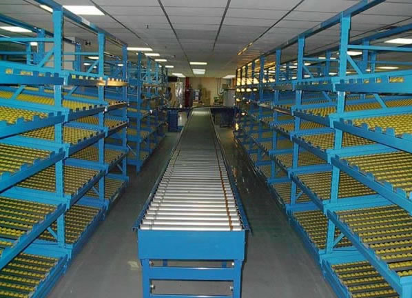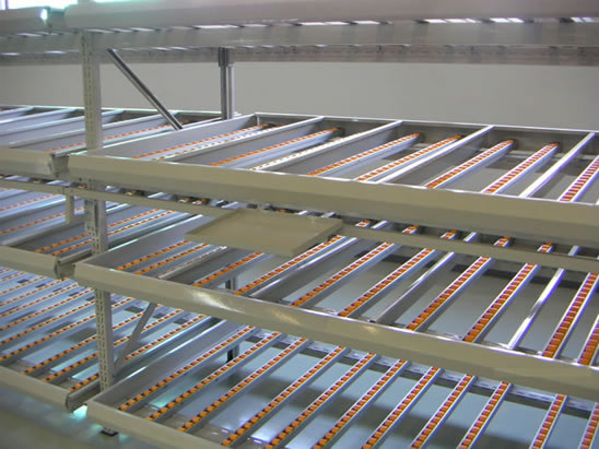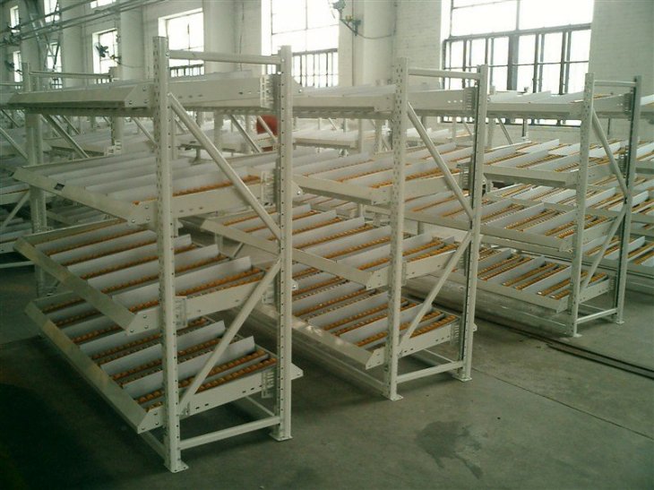 流利货架等同于流利式货架,产品常由中型横梁式货架演变而成,通过滚道将货物从配货端输送到取货端,货物借助重力自动下滑,可实现“先进先出”作业,使用成本低,存储速度快、密度大。通常使用在企业的精益生产流水作业。 流利货架的特点: 1、采用滚轮式铝合金等流力条,利用货物自重实现货的先进先出。 2、存取方便,适合于装配线两侧,配送中心等场所。 3、适用于大批量同类货物的存储,空间利用率较高,由其适合汽配工厂使用。 4、可配以电子标签,实现货物的信息化管理。 |