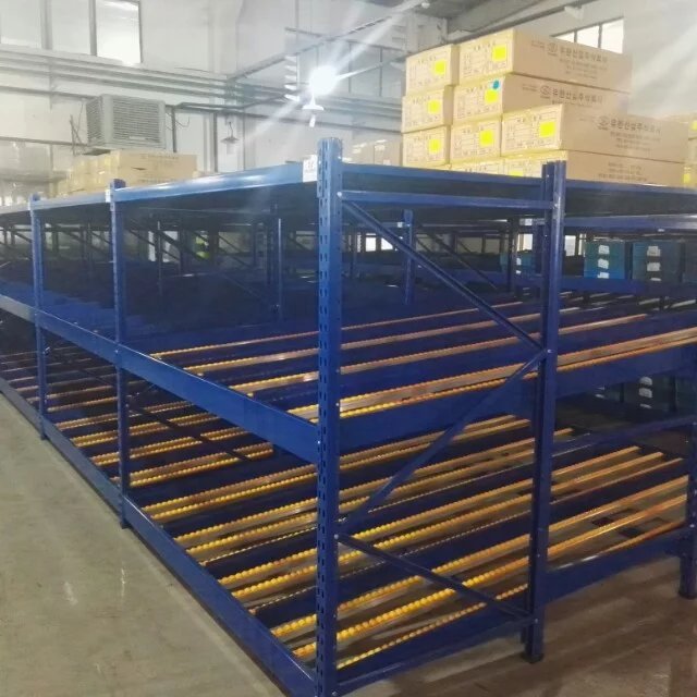 流利货架等同于流利式货架,产品常由中型横梁式货架演变而成,通过滚道将货物从配货端输送到取货端,货物借助重力自动下滑,可实现“先进先出”作业,使用成本低,存储速度快、密度大。通常使用在企业的精益生产流水作业。 流利货架的特点: 1、采用滚轮式铝合金等流力条,利用货物自重实现货的先进先出。 2、存取方便,适合于装配线两侧,配送中心等场所。 3、适用于大批量同类货物的存储,空间利用率较高,由其适合汽配工厂使用。 4、可配以电子标签,实现货物的信息化管理。